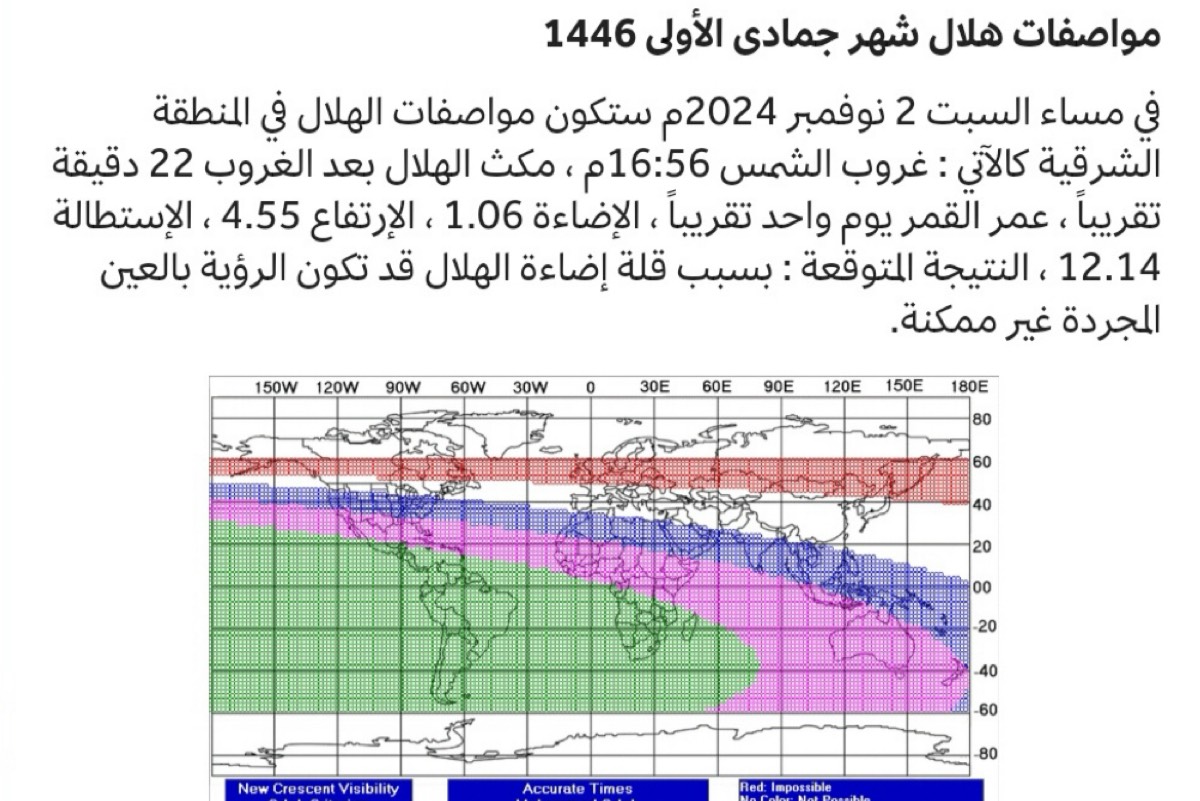 توقع عضو نادي التلسكوبات السعودية لهواية علم الفلك في منصة ”هاوي“ محمد الصويلح،، أن يغيب هلال شهر جمادى الأولى عن سماء المنطقة الشرقية مبكراً مساء السبت المقبل، الموافق 2 نوفمبر 2024 م، حيث سيغرب عند الساعة 17:19 م، أي بعد 23 دقيقة فقط من غروب الشمس.