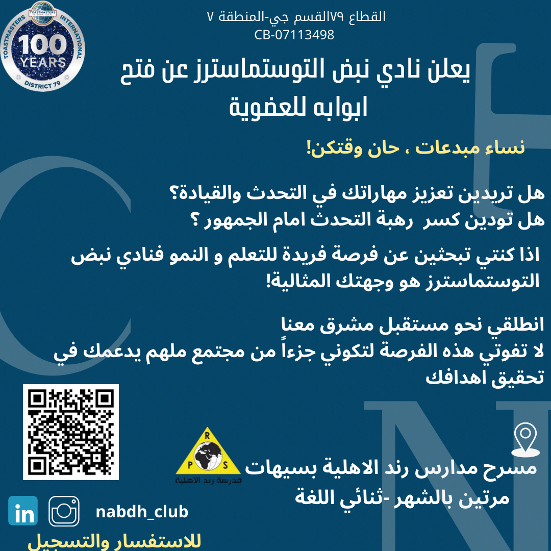 أعلن نادي ”نبض“ التوستماسترز عن فتح باب العضوية للراغبين في تطوير مهاراتهم في الخطابة والقيادة، وذلك في مقرّه بمدارس رند الأهلية بسيهات.