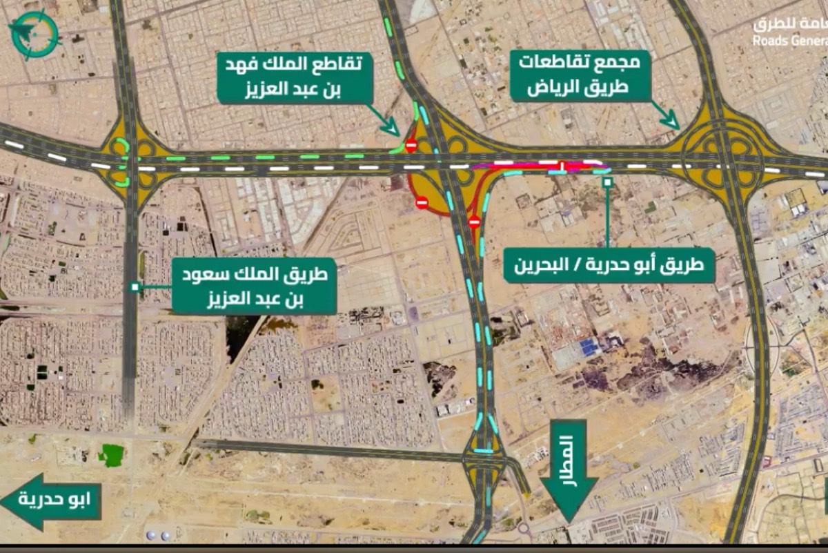 وأوضحت أن هذه التحويلة تأتي ضمن أعمال الصيانة المجدولة لطريق أبو حدرية البحرين في اتجاه الجنوب، والتي تمتد من تقاطع طريق الملك فهد بن عبدالعزيز إلى مجمع التقاطعات مع طريق الرياض.