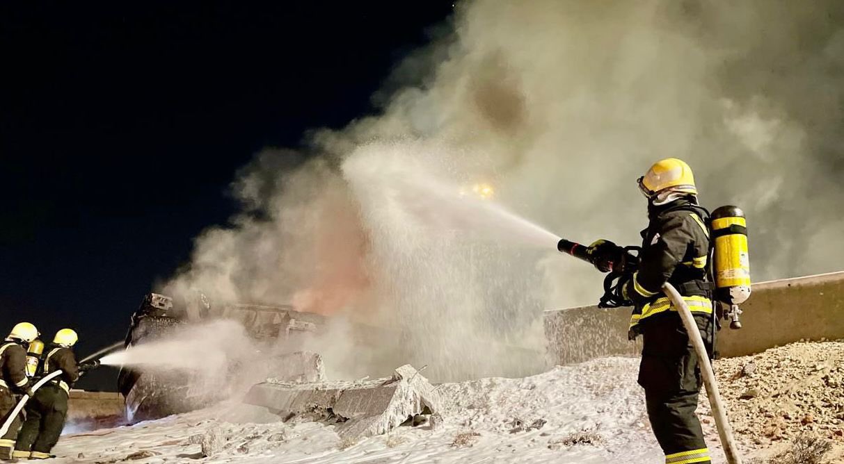 نجى سائق ناقلة وقود من حريقٍ هائل اندلع في مركبته على طريق الظهران - الجبيل السريع.