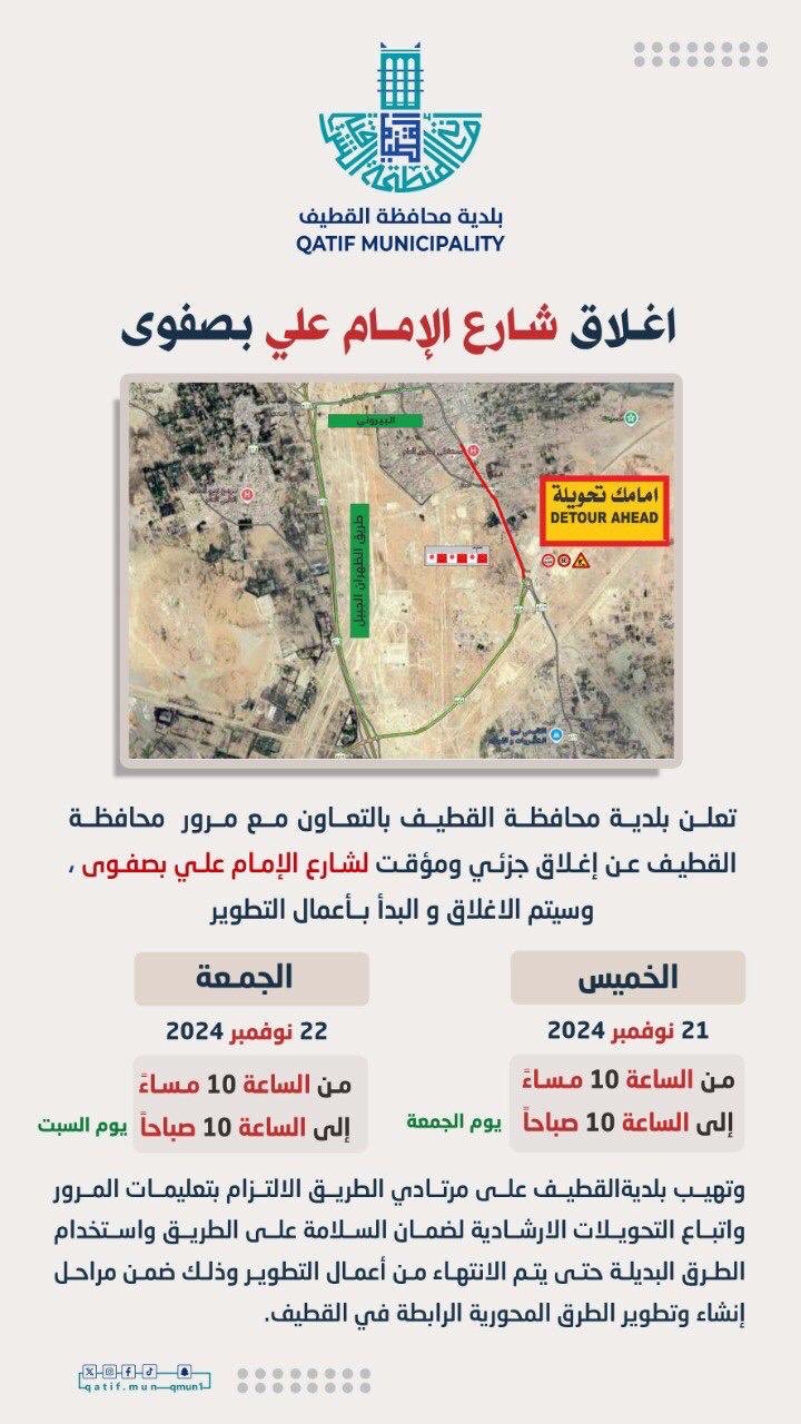أعلنت بلدية محافظة القطيف، بالتعاون مع مرور المحافظة، عن إغلاق جزئي ومؤقت لشارع الإمام علي بصفوى، لتنفيذ أعمال تطويرية هامة.