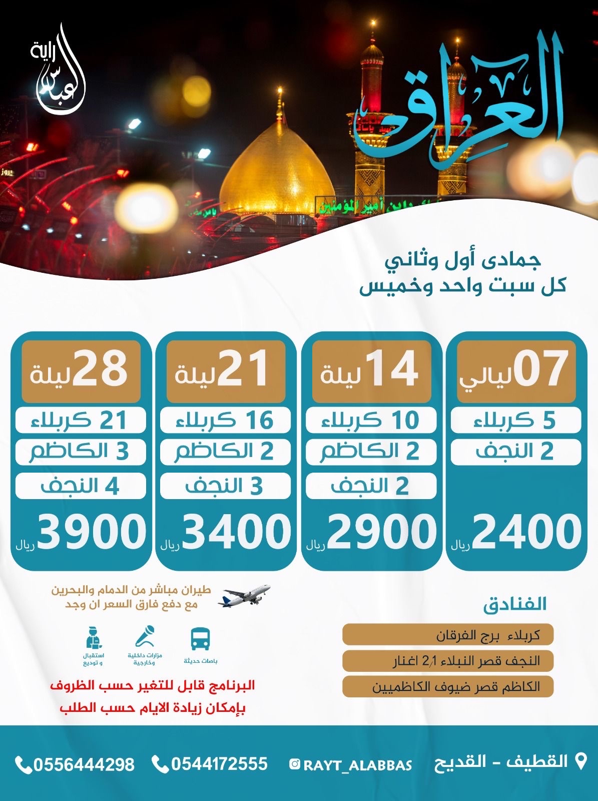 احجز رحلتك الآن إلى العراق مع ”راية العباس“ للاستمتاع بجوار الأئمة الأطهار