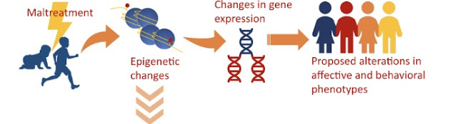 رسم تخطيطي يمثل المسار اللاجيني من سوء المعاملة إلى مخرجات صحية وصحة عقلية [5] .