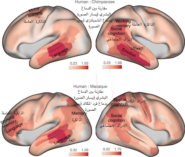 الصورة: مقارنة بين دماغ الشمبانزي «الصورة العلياء يمين» ودماغ بشري «الصورة العلياء يسار» ودماغ قرد المكاك «الصورة السفلى يسار» ودماغ بشري «الصورة السفلى يمين»: كلما زادت القيمة «احمرار اللون» كلما زاد الاختلاف بينها.