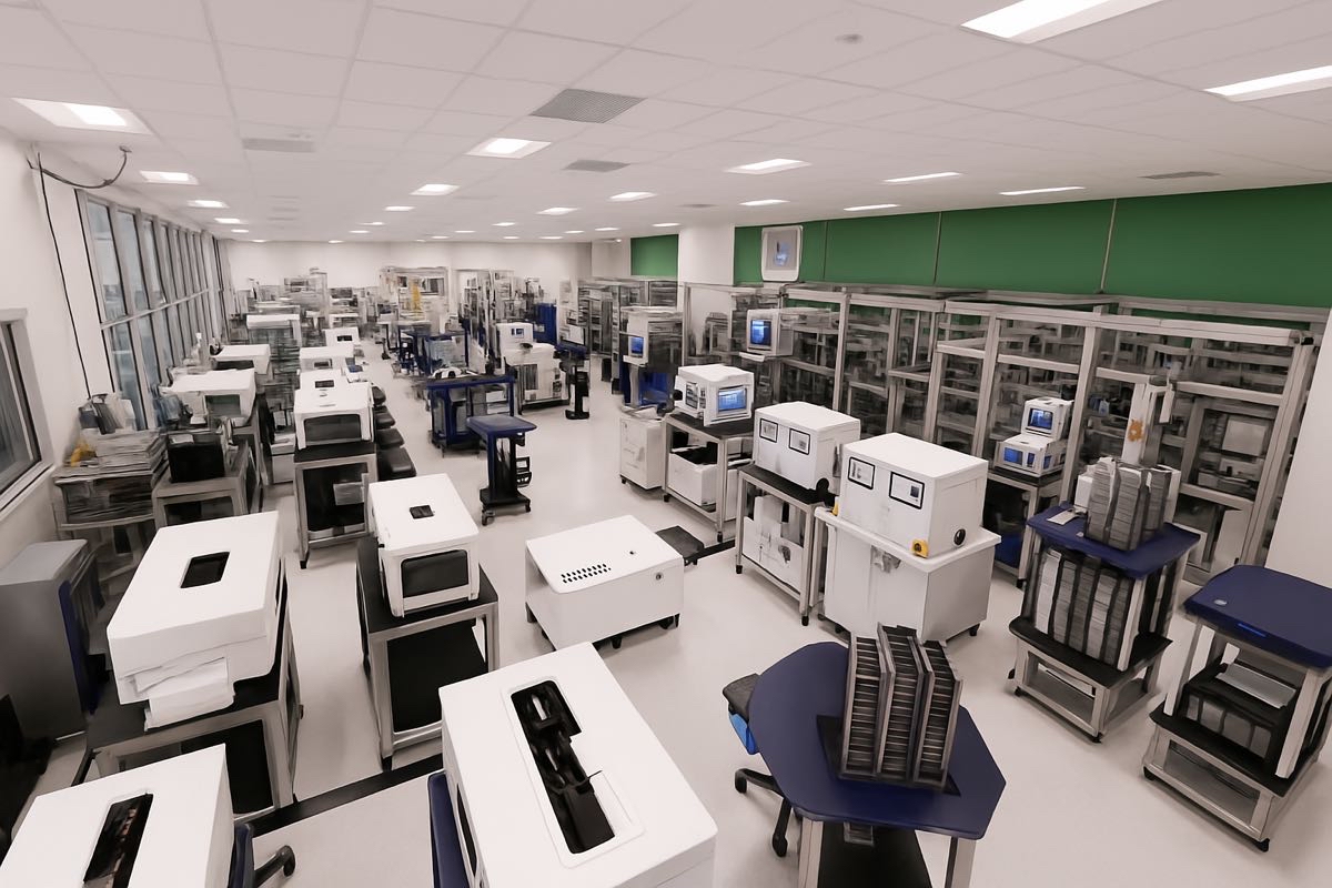 زرت مقر شركة (ريكورجن) في يوم شديد الحرارة من يونيو الماضي بمناسبة ”يوم التنزيل“ (Download Day)، وهو الحدث السنوي الذي تقدم فيه الشركة تحديثاتها للمستثمرين والذي تحدث فيه الرئيس التنفيذي لشركة إنفيديا، السيد هوانغ. تقع مكاتب الشركة في منطقة تشهد تجديدًا في وسط مدينة سولت ليك سيتي Salt Lake City, في مبنى كان سابقًا متجرًا لسلسلة ديك سبورتنج جودز Dick’s Sporting Goods. وبين مختبرات الشركة اللامعة المدارة بواسطة الروبوتات ومنطقة مكاتب الموظفين، يوجد جدار تسلق ضخم من ثلاثة طوابق — وهو ميزة ترفيهية وربما استعارة رمزية للمسار الشاق والصعب الذي تواجهه شركة لاكتشاف الأدوية عبر الذكاء الاصطناعي مثل شركة (ريكورجن).