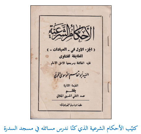 وأخذنا ندرس الكتاب تلو الكتاب، فمن ذلك أنه شرع في تدريسنا الرسالة العملية لمرجع التقليد في حينها، وهو السيد أبو القاسم الخوئي «ره»، وقد وصلنا فيها إلى أحكام الصلاة فقط. وقد كان ذلك في عام 1412ﻫ.