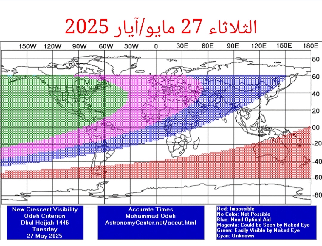 وفيما يتعلق بإمكانية الرؤية في مناطق أخرى من العالم، بيّن الصويلح أن رؤية الهلال ستكون ممكنة أيضاً في شرق القارتين الأمريكيتين، وكذلك في المناطق التي تشترك مع منطقة الخليج في جزء من الليل.