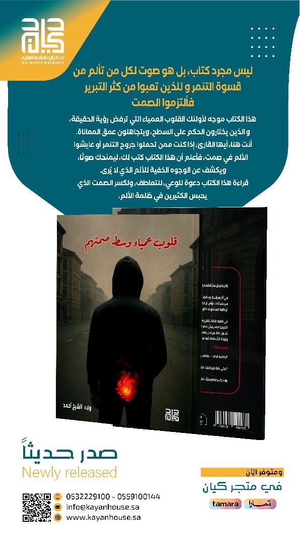 أصدرت الكاتبة ولاء الشيخ أحمد مؤخرًا كتابها الجديد بعنوان ”قلوب عمياء وسط صمتهم“ عن دار كيان للنشر والتوزيع، ليكون العمل الثالث في مسيرتها الأدبية بعد تجربتين لافتتين تركتا بصمتهما في المشهد الثقافي المحلي.