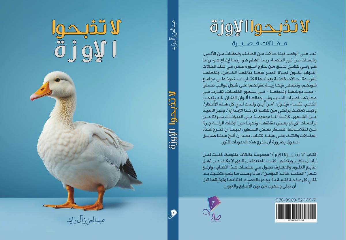 أصدر الأديب عبد العزيز آل زايد مؤخرًا كتابه الجديد بعنوان ”لا تذبحوا الإوزة“، عن دار صاد للنشر والتوزيع بالجزائر، ليقدّم للقارئ مجموعة من المقالات القصيرة التي تجمع بين عمق المعنى وبساطة العبارة، في قالب أدبي أقرب إلى ”كبسولات فكرية“ خاطفة، تنير العقل وتداعب الروح.