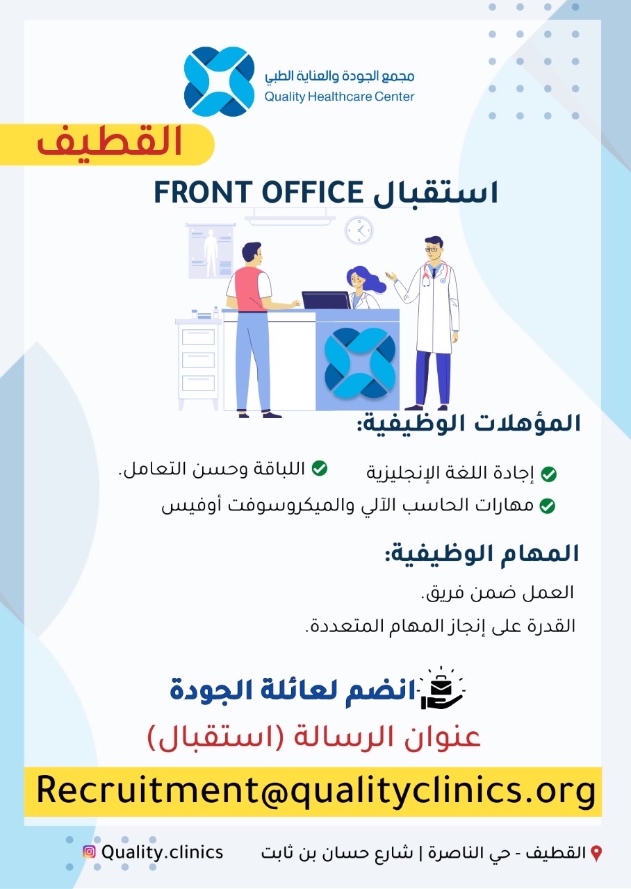 يعلن مجمع الجودة والعناية الطبي، بمحافظة القطيف، عن توفر شاغر وظيفي بمسمى موظف/ة استقبال.