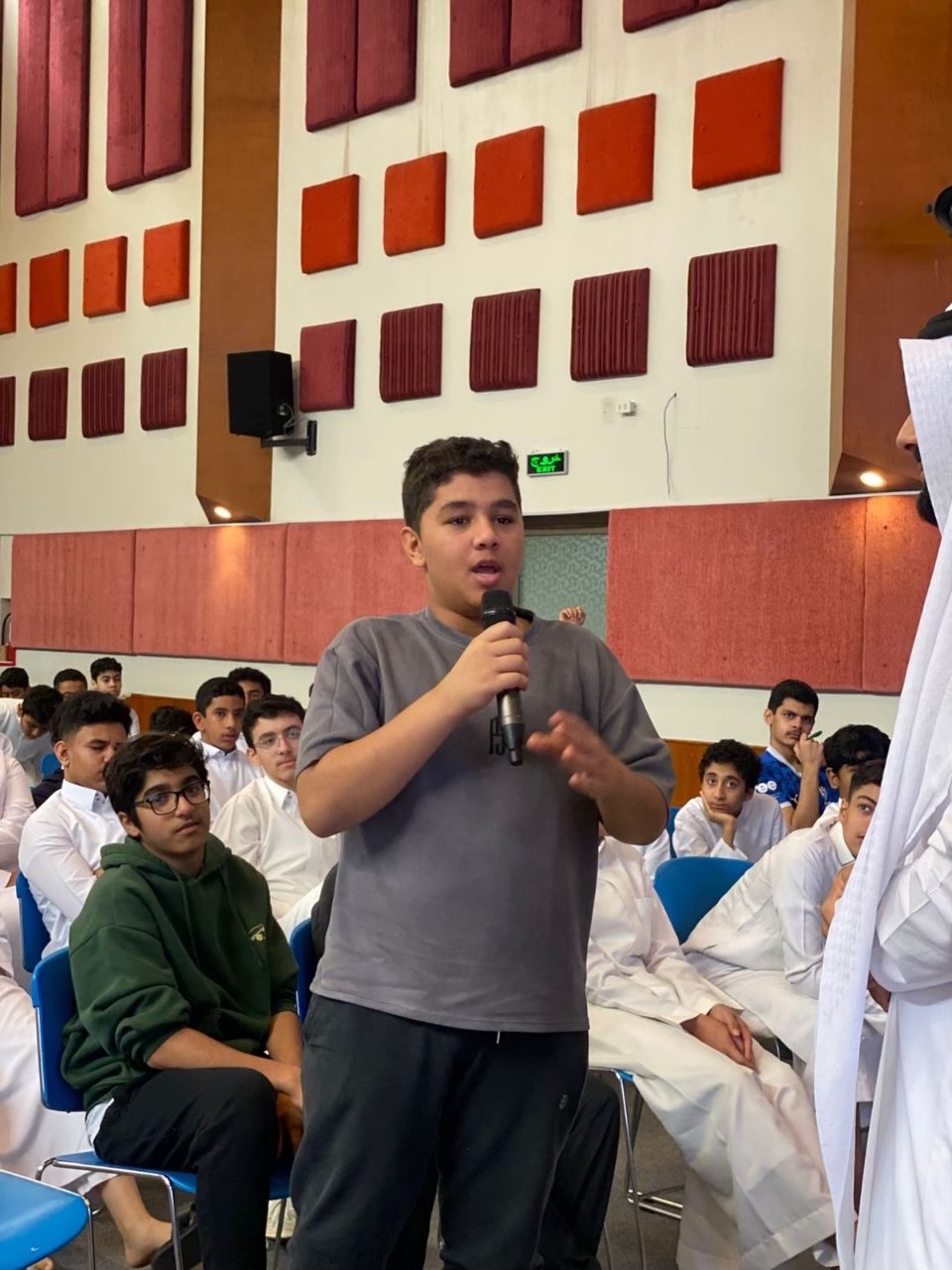 مذكرًا بفوز العالم السعودي عمر ياغي بجائزة نوبل في مجال الكيمياء، مما يحدو بنا كطلاب يافعين أن نحافظ على صحتنا ونغذي عقولنا بالعلم والمعرفة لنكون دائمًا في المقدمة على مستوى الوطن والعالم، مستفيدين من الإمكانات التي وفرتها لنا وزارة التعليم ووزارة الصحة؛ تلك التوأمة بين العلم الذي يمثل العقل ونشاطه، وبين الصحة التي تمثل الجسم وسلامته، ليكونا تجسيدًا للحكمة القائلة: ”العقل السليم في الجسم السليم.“