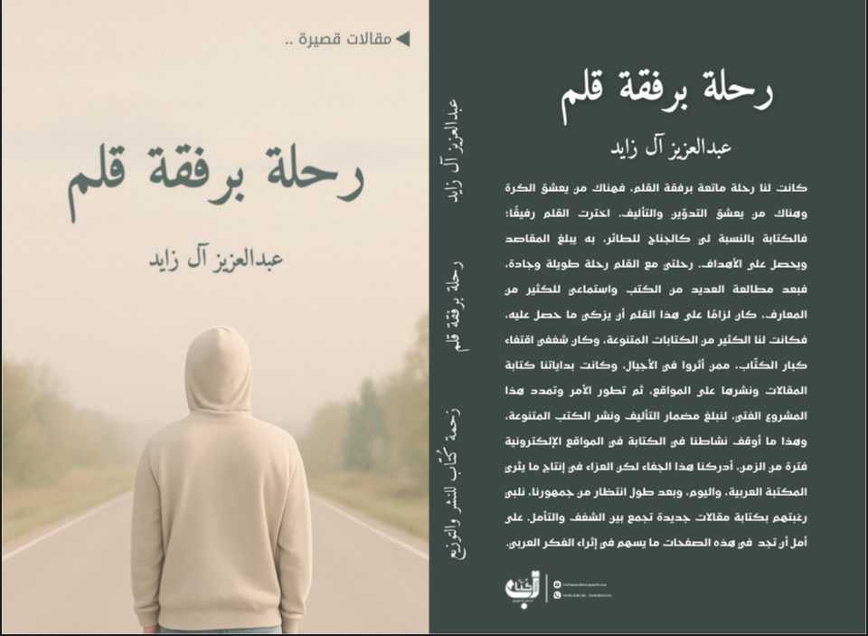 صدر مؤخرًا عن دار «زحمة كُتّاب» للنشر والتوزيع كتاب جديد يحمل عنوان «رحلة برفقة قلم» للأديب السعودي عبدالعزيز آل زايد، وهو عمل أدبي وفكري يزاوج بين التأمل والبوح الصادق، ويقدّم خلاصة تجربة الكاتب مع الكلمة ومسيرته الطويلة في ميدان الكتابة والوعي الإنساني.