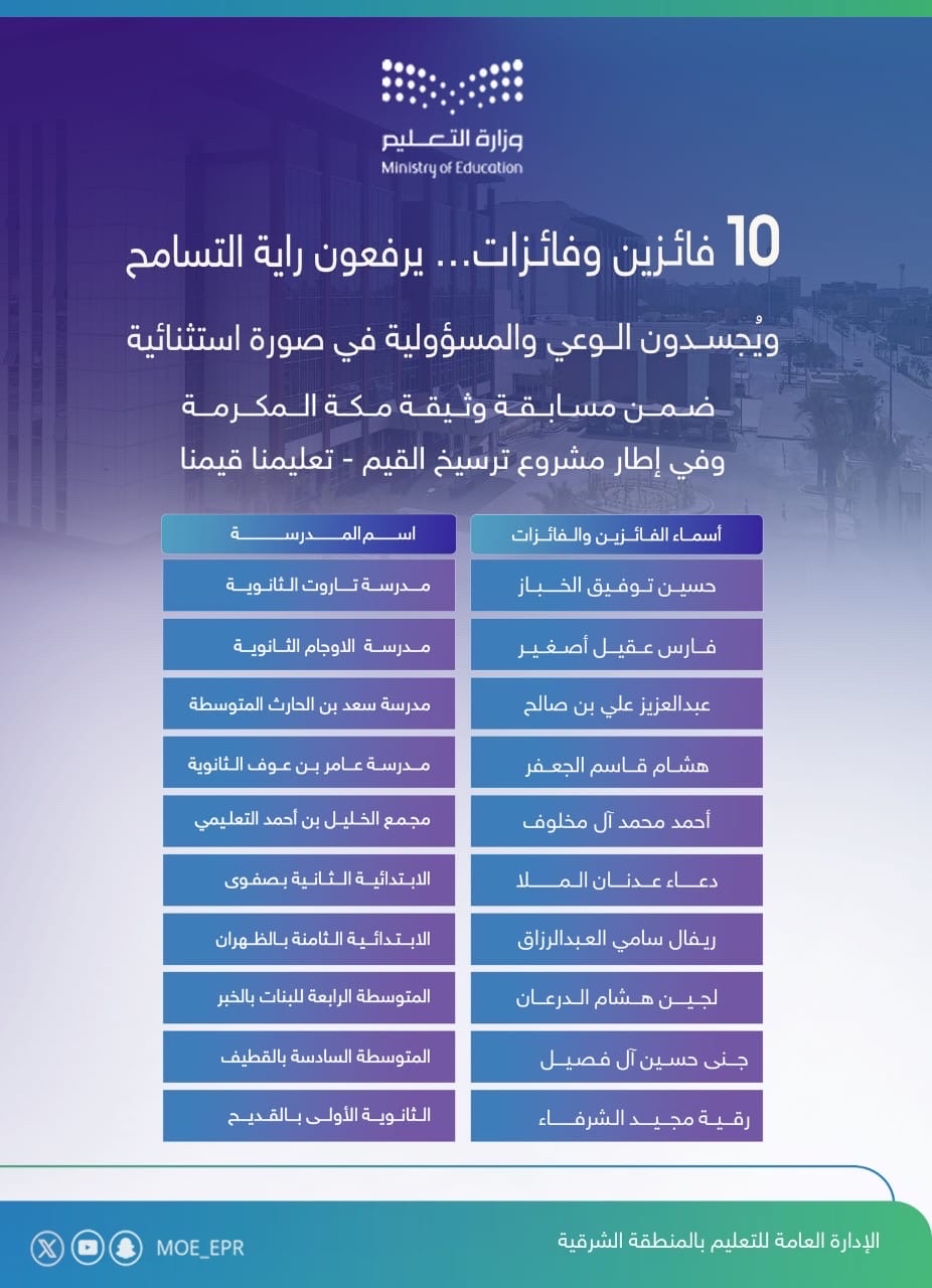 توجت الإدارة العامة للتعليم بالمنطقة الشرقية عشرة طلاب وطالبات بجائزة التميز في مسابقة ”وثيقة مكة المكرمة“، وذلك في خطوة نوعية تهدف إلى تعزيز الوعي الطلابي ورفع مستوى المسؤولية الوطنية ضمن مشروع ”تعليمنا قيمنا“ لترسيخ القيم الأخلاقية في البيئة التعليمية.