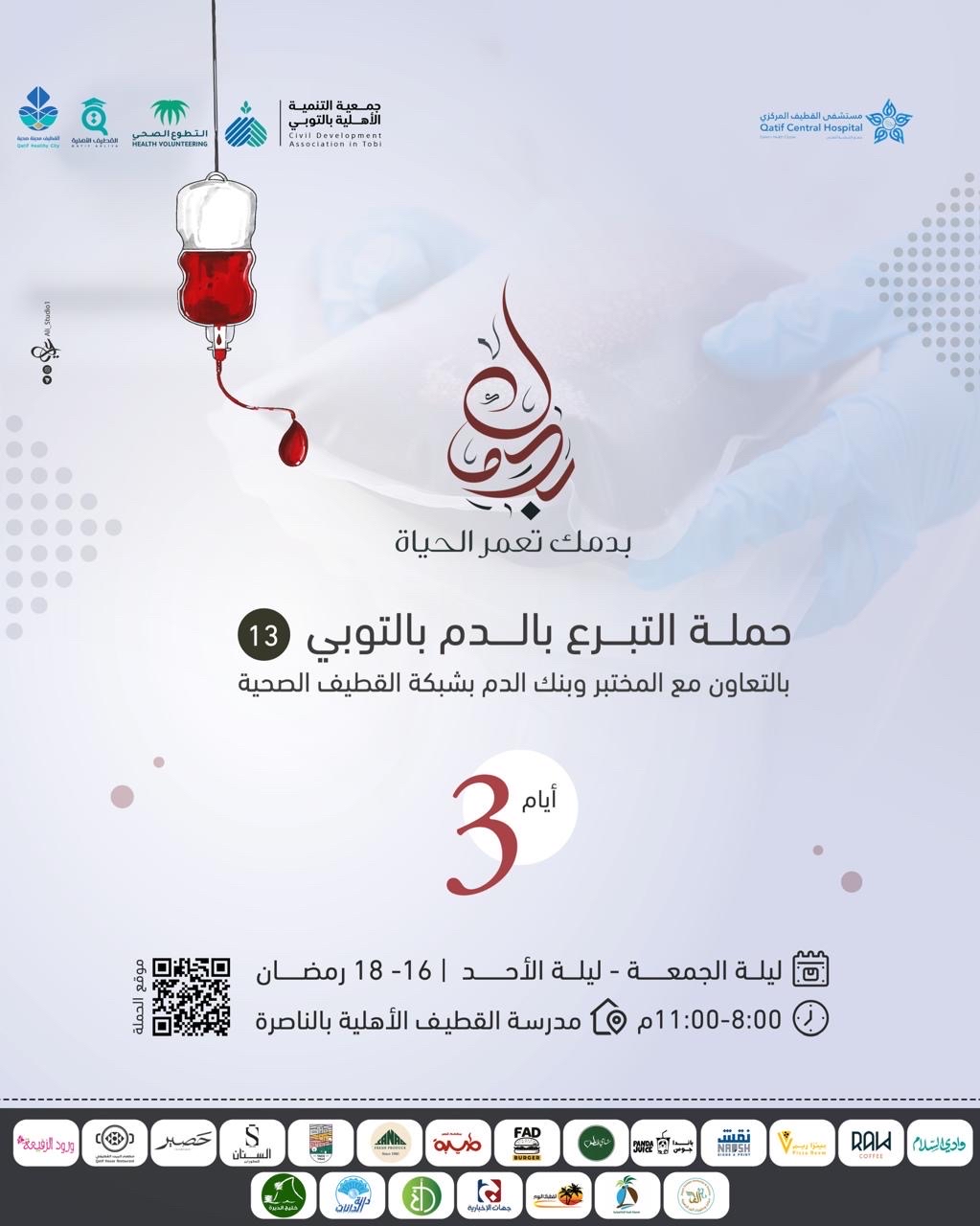 تطلق جمعية التنمية الأهلية بالتوبي، بالشراكة مع شبكة القطيف الصحية، النسخة الثالثة عشرة من حملة التوبي للتبرع بالدم الرمضانية، خلال الفترة من 16 إلى 18 رمضان بمدرسة القطيف الأهلية بالناصرة، لدعم المخزون الطبي.