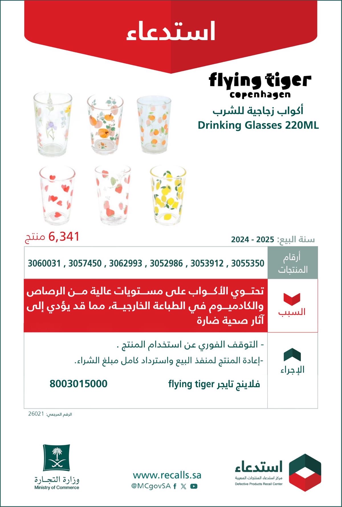 أعلنت وزارة التجارة اليوم عن استدعاء فوري ل«6,341» كوباً زجاجياً للشرب من علامة «Flying Tiger»، لاحتوائها على الرصاص والكادميوم، ضمن جهودها الرقابية الصارمة لحماية سلامة المستهلكين بالسوق السعودي.