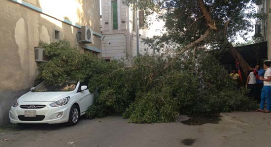 وفي محافظة الجبيل يوجد حالتان تضمنتا سقوط شجرة على مركبة، وسقوط مظلة على سيارة.