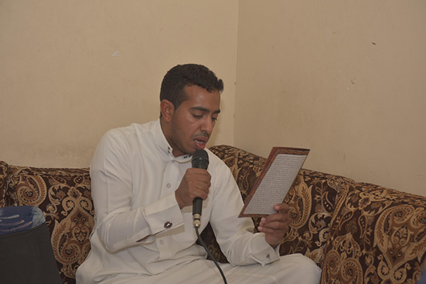 وقال لـ ”جهينة الأخبارية“ أن برنامج المجلس ”الدرس“ يبدأ عادة بعد وجبة الإفطار مباشرة فيجتمع في المجلس الأقارب والجيران والأصدقاء ويتناوب من يستطيع التلاوة على قراءة القرآن أما الأمي فيكتفي بالاستماع وإطلاق عبارات الدعاء والثناء على القارئين.