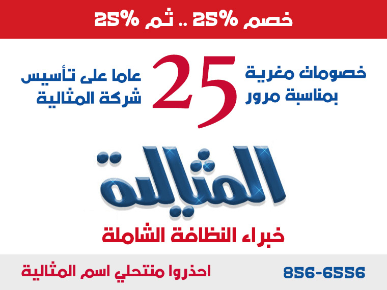 خصومات مغرية بمناسبة مرور 25 عاما على تأسيس ”شركة المثالية الدولية“ للنظافة الشاملة