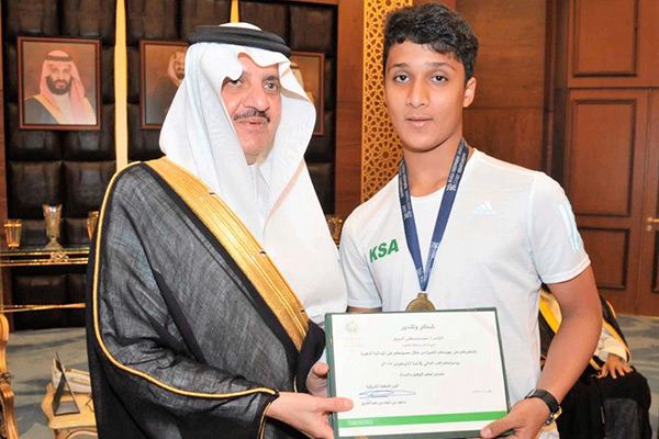 كرم أمير المنطقة الشرقية سعود بن نايف البطل السعودي محمد السويق لاعب المنتخب السعودي للتايكوندو ونادي السلام في العوامية لتحقيقه ذهبية العالم في التايكوندو للناشئين في مصر.