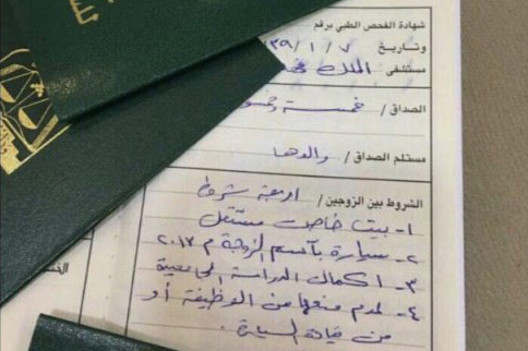 وبّينت الصورة وثيقة الزواج وقد أدرجت فيها عدة شروط في مقدمتها بيت مستقل للزوجة وسيارة باسمها، إلى جانب تمكينها من إكمال دراستها الجامعية، وعدم منعها من الوظيفة أو قيادة السيارة.