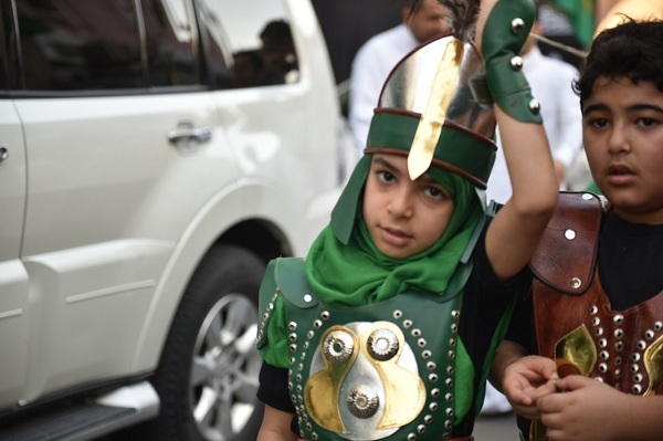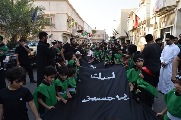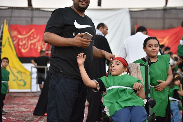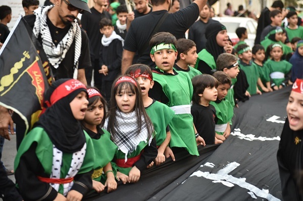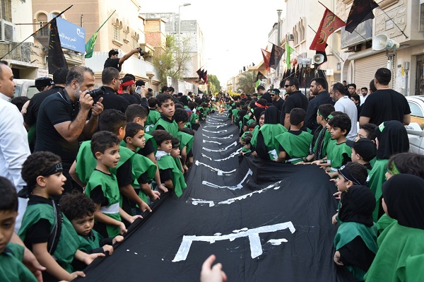 وتوشح الأطفال بزيٍ موحد تمثل في اللونين الأسود والأخضر، وعصابات حسينية على الجبين، هاتفين بشعاراتٍ ولائية مؤكدين بها على رسالتهم «نحن نحب الرضيع ودمه لن يضيع»، «لبيك ياحسين لبيك يارضيع» و«خذ حتى ترضى».
