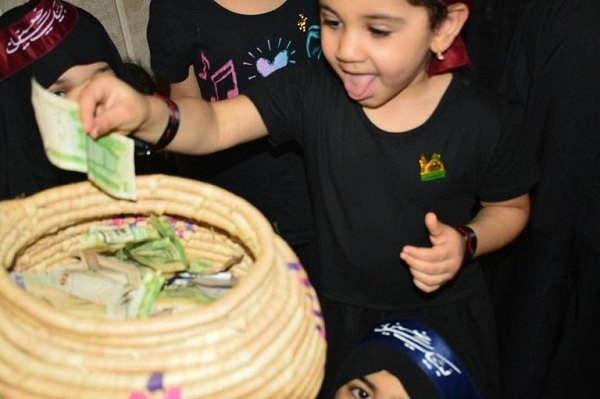 وعملت اللجنة في ختام اليوم العاشر على تعليم الأطفال ثقافة إخراج الصدقة لدفع البلاء عن الإمام الحجة «عجل الله فرجه الشريف» وكتابة أمنية للإمام الحسين ووضعها في قارورة بنية إيصالها للإمام الحسين .