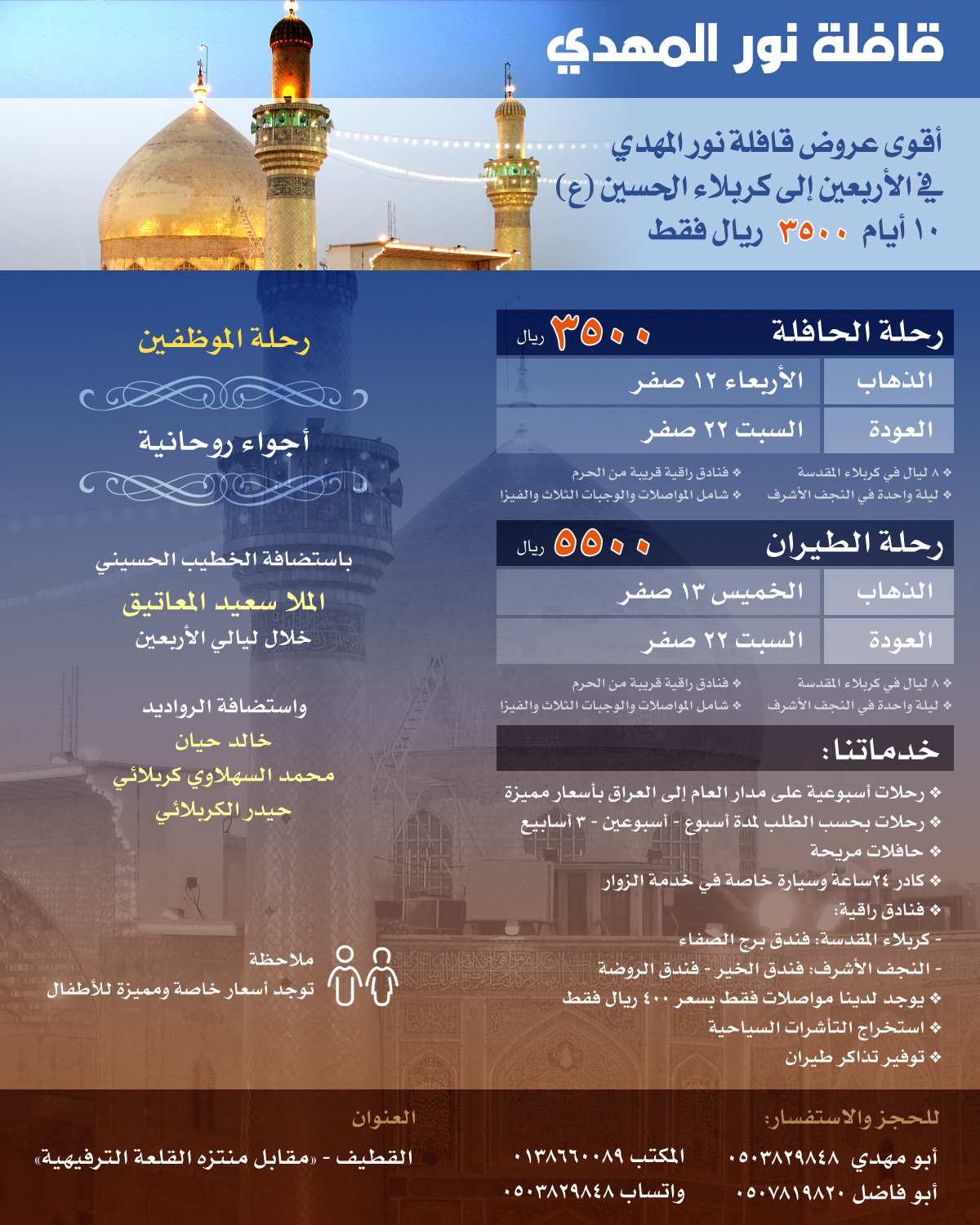 أقوى عروض قافلة نور المهدي في الأربعين إلى كربلاء الحسين 10 أيام 3500 ريال فقط