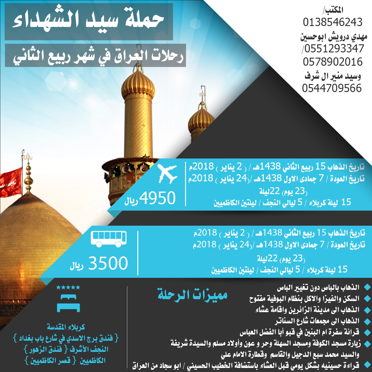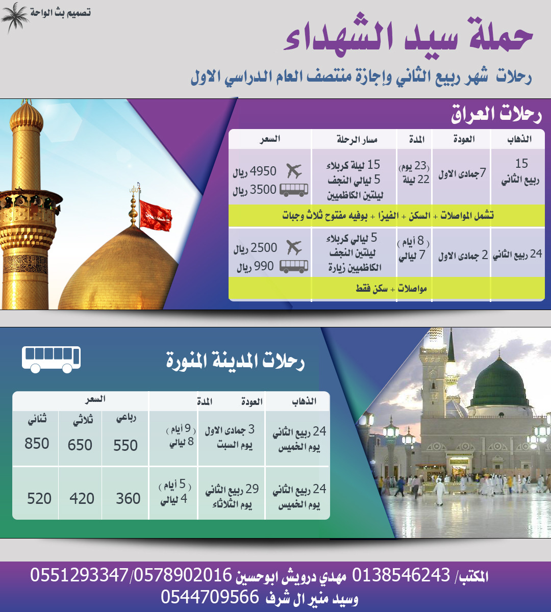 رحلات شهر ربيع الثاني وإجازة النصف للعراق والمدينة مع حملة سيد الشهداء