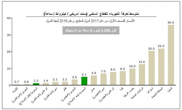 ورغم تغيير الشريحة الأولى إلى 0,18 ريال لكل كيلو واط ساعة، تبقى تعريفة الشريحة الأولى لاستهلاك الكهرباء في القطاع السكني «6000 كيلو واط ساعة فأقل» منخفضة مقارنة بالدول الأخرى، بغض النظر عن التحويل النقدي من حساب المواطن لمستحقيه وفقاً للمعايير المتبعة.
