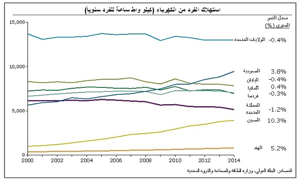 ومن جهة أخرى، فإن نصيب الفرد من استهلاك الطاقة في المملكة يبلغ حالياً 55 برميل نفط مكافئ سنوياً، ويعد من بين أعلى المعدلات في العالم، إذ يبلغ ضعف استهلاك الفرد في دول صناعية مثل ألمانيا وفرنسا واليابان. والأهم من ذلك هو أن استهلاك الفرد في المملكة مستمر في الارتفاع بمعدل 2%، أي ضعف المعدل العالمي البالغ 1%.