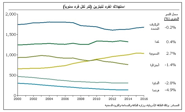 وبالنسبة للمركبة الواحدة، يبلغ استهلاك البنزين في المملكة 2,755 لتر سنوياً، بما يفوق استهلاك المركبة في الولايات المتحدة وكندا بأكثر من 20%، وأكثر من ثلاث أضعاف استهلاك المركبة الواحدة في ألمانيا. عند المقارنة بالدول عالية الاستهلاك، مثل كندا والولايات المتحدة الأمريكية، نجد أن معدل نمو الطلب فيها أقل بكثير من معدل النمو في المملكة، ففي الوقت الذي بلغ فيه معدل نمو الطلب على البنزين في المملكة 5,3% سنوياً، كان معدل النمو في كندا 1,3% وفي الولايات المتحدة 0,6%، في حين انخفض استهلاك هيكلة أسعار الطاقة.. وطاقة المستهلكالبنزين في دول أخرى مثل ألمانيا وفرنسا، كما أن الاتجاه العالمي واضح في الانحياز نحو المركبات عالية الكفاءة في استخدام الوقود وغير الملوثة للبيئة.