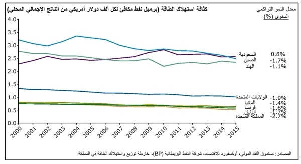 هيكلة أسعار الطاقة.. وطاقة المستهلكوفي هذا السياق، تجدر الإشارة إلى أن استهلاك المملكة من الطاقة هائل، نسبة لعدد السكان ولنشاط المملكة الاقتصادي، حيث يبلغ 4,7 مليون برميل نفط مكافئ يومياً تتكون من منتجات عديدة، مثل الغاز الطبيعي، وسوائل الغاز، والبنزين، والكيروسين، والديزل، وزيت الوقود، والأسفلت وغيرها. وبالفعل فقد شهد إجمالي الطلب على الطاقة في المملكة وتيرة نموٍ سريعة للغاية، فاقت نسبتها 5% سنوياً خلال الفترة 2005 - 2016 متجاوزةً بذلك معدل النمو السكاني ونمو إجمالي الناتج المحلي خلال الفترة نفسها. وفي حال استمرار النمو على نفس الوتيرة، فسيتخطى الطلب المحلي على الطاقة 8 ملايين برميل نفط مكافئ يومياً في عام 2030م. وحالياً، يعادل استهلاك المملكة من الطاقة نحو 35% من إجمالي الإنتاج، ويشمل ذلك النفط الخام والغاز الطبيعي ومشتقاتهما. وما يدلل على ضخامة الاستهلاك المحلي مقارنة بالمؤشرات المعتبرة عالمياً، فقد بلغ نمو كثافة استهلاك الطاقة على مدى الخمسة عشر هيكلة أسعار الطاقة.. وطاقة المستهلكعاماً الماضية 0,8% سنوياً، مقارنة بانخفاض في أغلب دول العالم، بما في ذلك الدول النامية، وبهذا المستوى تحتل المملكة المرتبة الثانية في كثافة الطاقة على مستوى دول العشرين «G20». وتعد ”كثافة استهلاك الطاقة“ المقياس العالمي لمستوى إنتاجية الطاقة في بلدٍ أو قطاعٍ معين، وتمثل الطاقة المستهلكة لكل ألف دولار من الناتج المحلي الإجمالي، وكلما ارتفعت كثافة استهلاك الطاقة كانت دليلاً على انخفاض إنتاجية الطاقة.