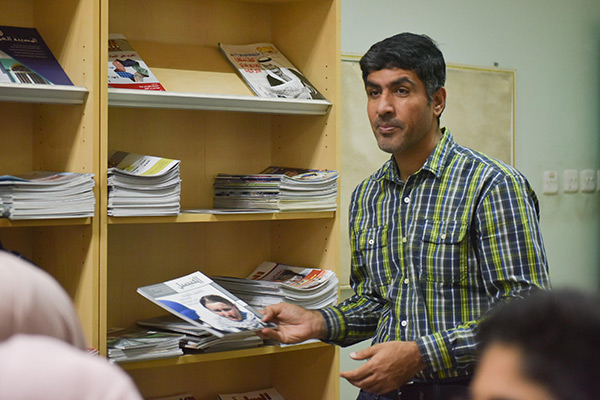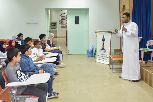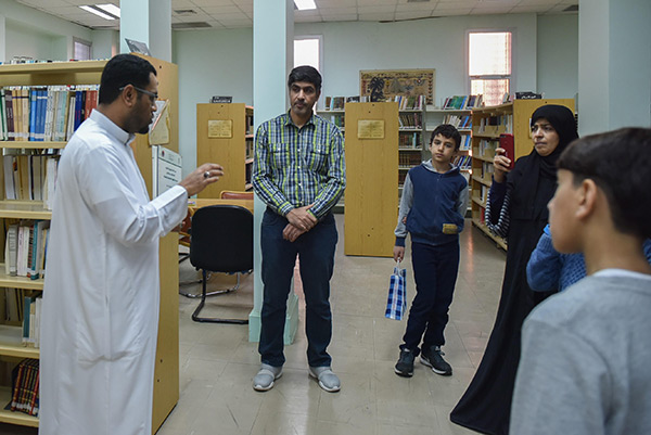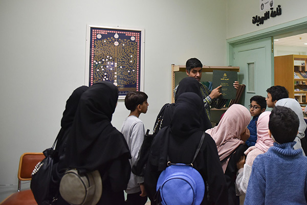 ورافقهم أثناء زيارتهم للمكتبة مصطفى آل يتيم لتعريفهم بأركان المكتبة، منها ركن الكتاتيب والمعلم، ركن المهن والحرفيين، مركز معلومات المدينة، وكتب لغة برايل، واطلعوا على محتويات مكتبة الطفل.