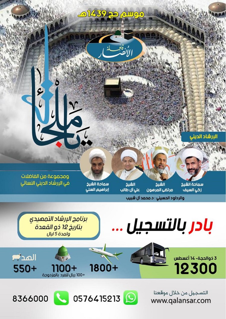 قافلة الأنصار تعلن عن افتتاح التسجيل لموسم الحج القادم 1439 هـ ، هذا ويسرنا أن نحظى بشرف الأخذ بأيديكم في رحلة صناعة الإنسان حيث ينبغي على الحاج أن يوجه قلبه وجوارحه لله لينتفع بالحج ويغير مسيرة حياته بعد عودته سالم غانما إلى أهله وأحبته.
