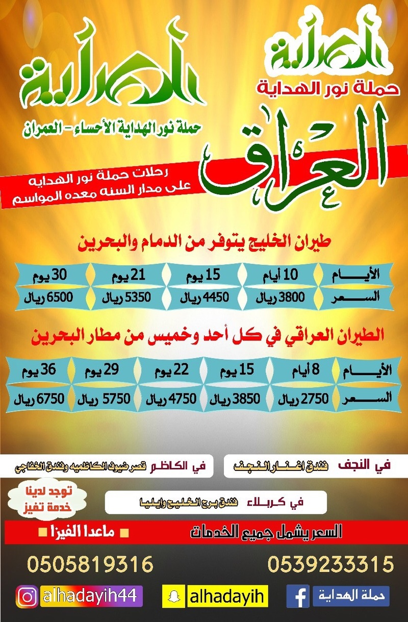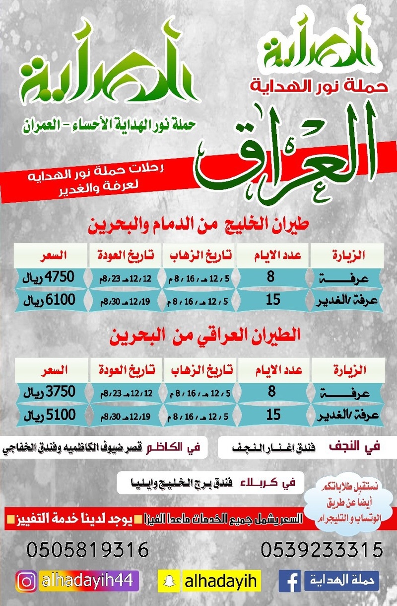 تعلن حملة نور الهداية بالاحساء لتسيير رحلاتها للعراق في عرفة وعيد الغدير