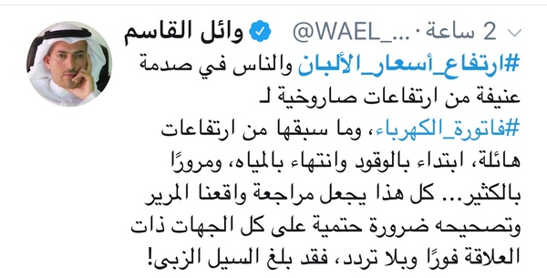 وأعلن مشعل الزاهد عبر الوسم مقاطعته بقوله مستنكرًا ”لماذا استهداف دخل المواطن بحجج غير مقنعة على حساب ذوي الدخل المنخفض والمحدود، قبل أيام فاتورة الكهرباء واليوم اسعار الألبان وماذا بعد ذلك سيكون ضحيتها المواطن“.