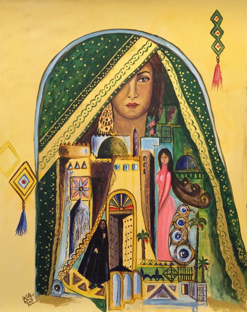 وأشارت إلى المرأة القديمة بعباءتها المحتشمة وغطاء الوجه، لافتة إلى جمال المرأة قديما بدون العباءة حيث تحافظ على رشاقتها وحشمتها وشعرها الطويل، منوهة في اللوحة إلى الجمال الرباني بدون مظاهر الزينة الحالية كعمليات التنحيف والتجميل وغيرها.