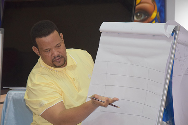 ليبدأ بعدها بتلوين إحدى اللوحات، أكد خلالها ضرورة عدم رسم كل شيء في المشهد، والاكتفاء بالأكثر أهمية كما يراها الفنان وكما تخدم رؤيته الجمالية.