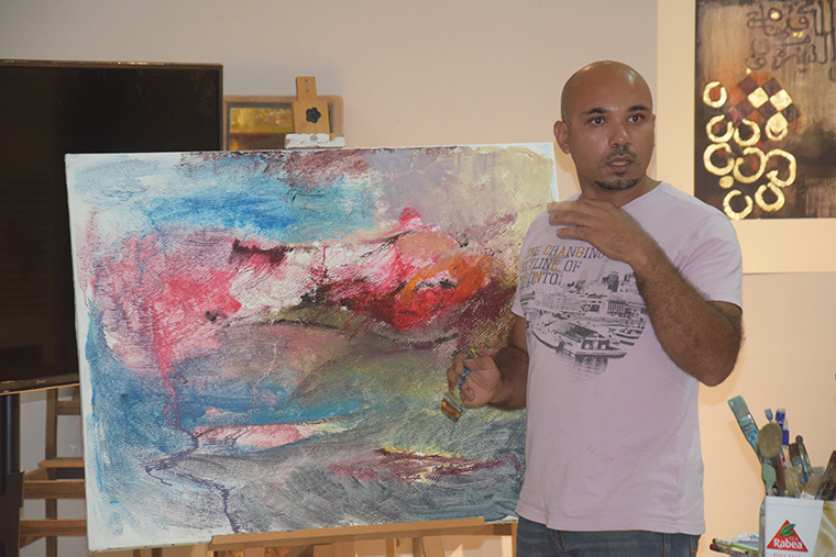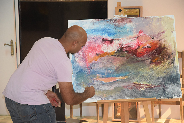 وأشار إلى ما تتطلبه بعض اللوحات التجريدية من بناء يصل الى ستة أشهر او أكثر، لافتا الى فوائد الرسم في التعويد على الصبر، وتهذيب النفس، والارتقاء بالذائقة والأحاسيس والتي تنفر من البشاعة بعد رؤية الجمال.