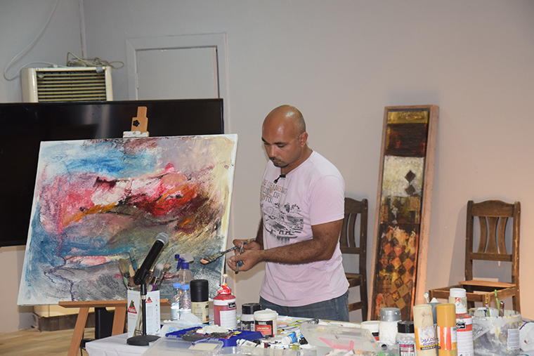 واستعرض أنواع الفرش واستخداماتها وتأثير كل منها في اللوحة، لافتا إلى صعوبة الإعتماد على فرشاة واحدة، لكامل العمل.