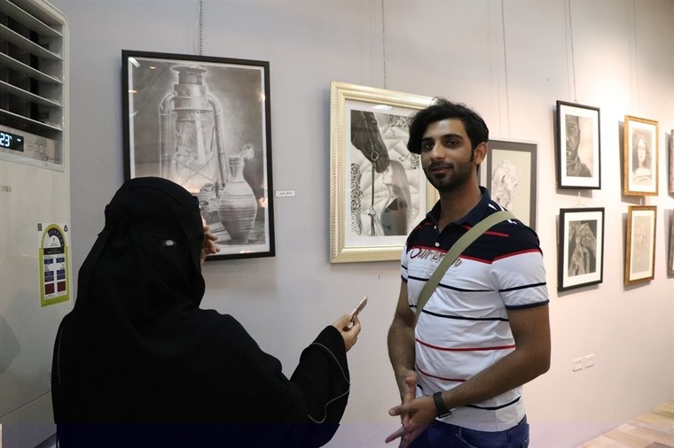 وأشار الى مشاركته في المعرض بلوحتين أخريين إحداهما من الطبيعة التراثية الصامتة وباستخدام تقنية ”التهشير“ في التظليل بدل الدعك للدمج ”في تجربة جديدة لإظهار ملامس الفخار“، بالاضافة إلى رسم الفنانة بثينة الرئيسي ببودرة الفحم بعد تصويت الجمهور.