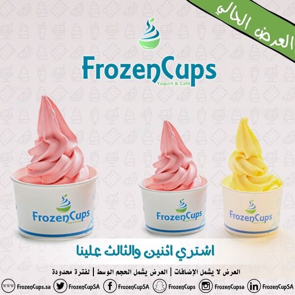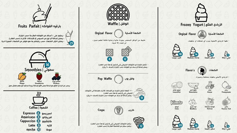 - الزبادي المثلج: الأصلي والجح وعمار والباشن فروت والرمان والفواكة المشكلة.