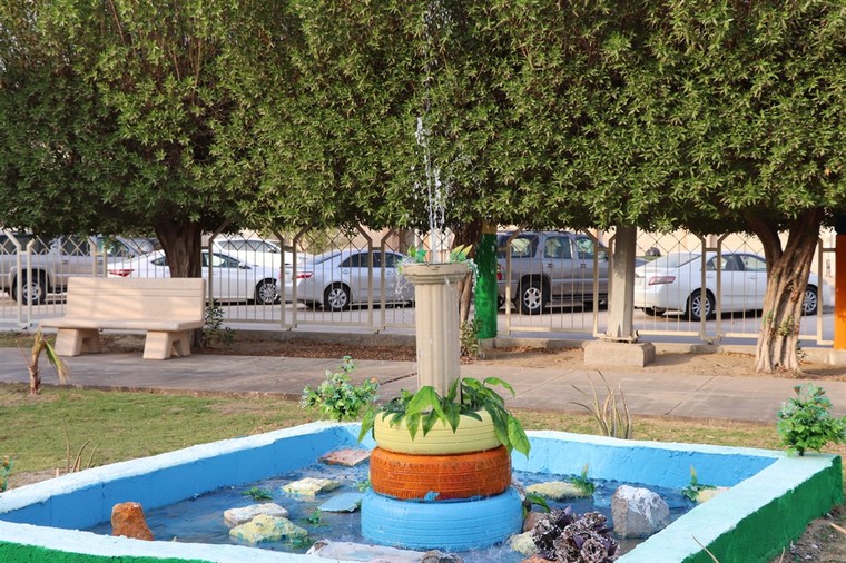 بنى عدد من المتطوعين والمتطوعات ضمن مبادرة ”بصمة حي“ مع فريق مشاة صفوى للسيدات وبالتعاون مع فريق ديرتنا ملونة نافورة بطريقة مبتكرة من خلال إعادة تدوير بعض الأدوات في وسط حديقة المحمل بصفوى.
