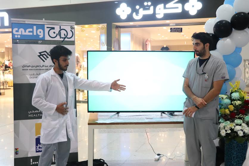 شارك 10 طلاب طب من جامعة الامام عبد الرحمن بن فيصل، مساء الخميس، بالتعريف بأهمية الفحص قبل الزواج وتجنب الأمراض الوراثية، وذلك خلال الحملة التثقيفية التي أطلقوها تحت عنوان «زواج واعي» بدارين موال في الدمام.