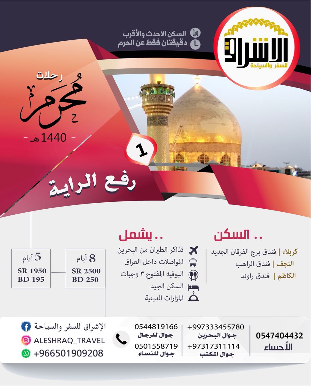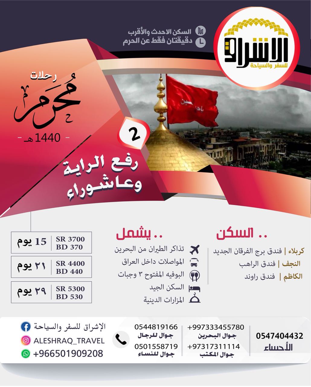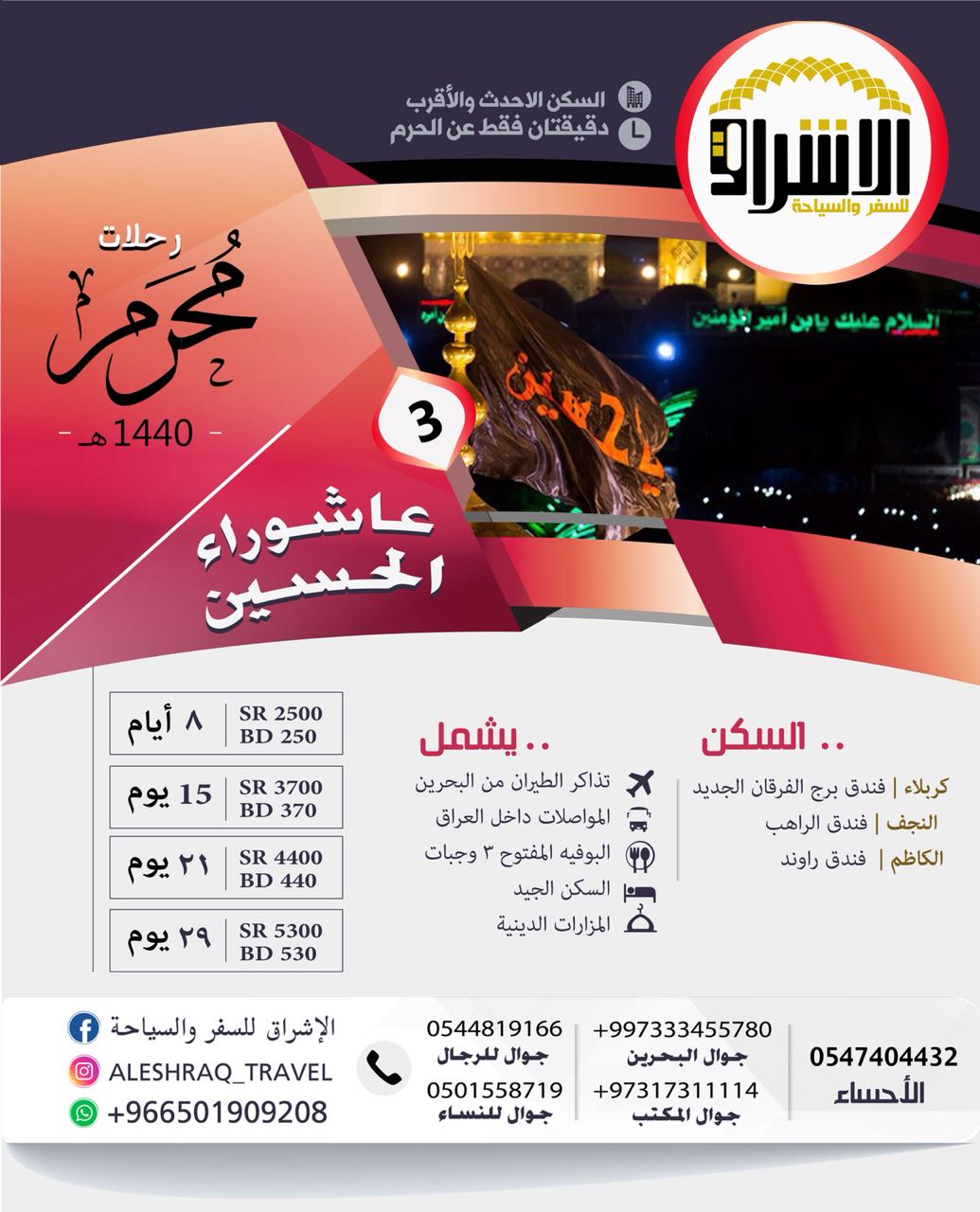 #006bb8 ;">تمتع بإطلالة مميزة على حرم الإمام الحسين وأخيه أبا الفضل العباس مع ” #d10031 ;">الإشراق للسفر والسياحة