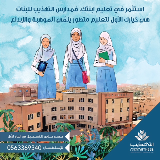 مدارس التهذيب للبنات «ابتدائي ومتوسطة وثانوية» هي خيارك الاول لتعليم متطور ينمي الموهبة والإبداع فهي مدارس أهلية بمناهج اثرائية اضافية باللغة الانجليزية تشمل: