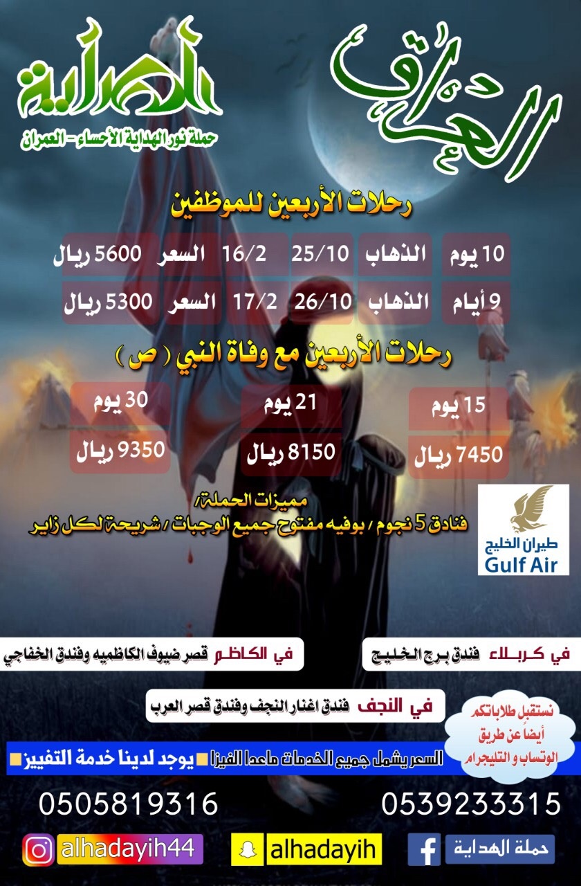تعلن حملة نور الهداية بالاحساء عن تسيير رحلاتها للعراق في أربعين الأمام الحسين