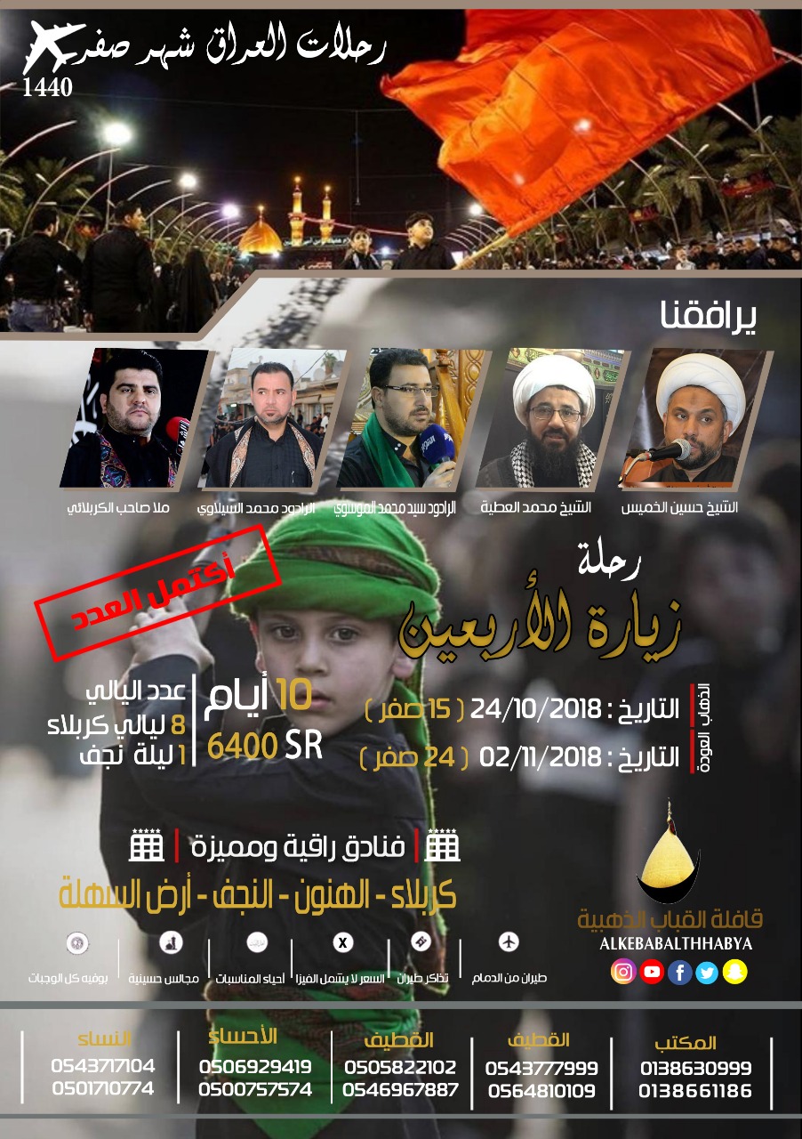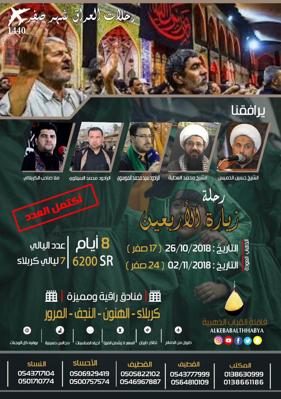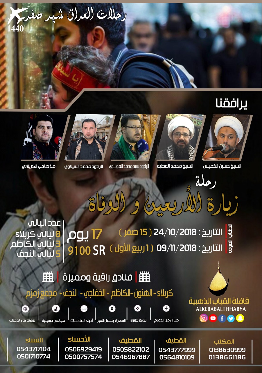 تعلن #b80000 ;">قافلة القباب الذهبية عن استمرار التسجيل لرحلة زيارة الاربعين ووفاة النبي ﷺ 1440