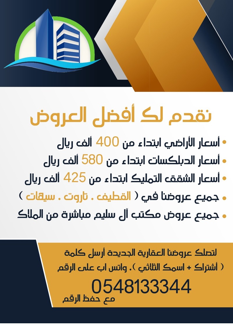 • كما يوجد لدينا عروض لأراضي وفلل ودبلكسات في مختلف مناطق القطيف وسيهات ..