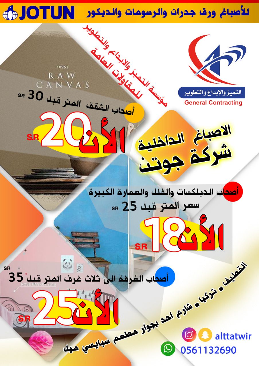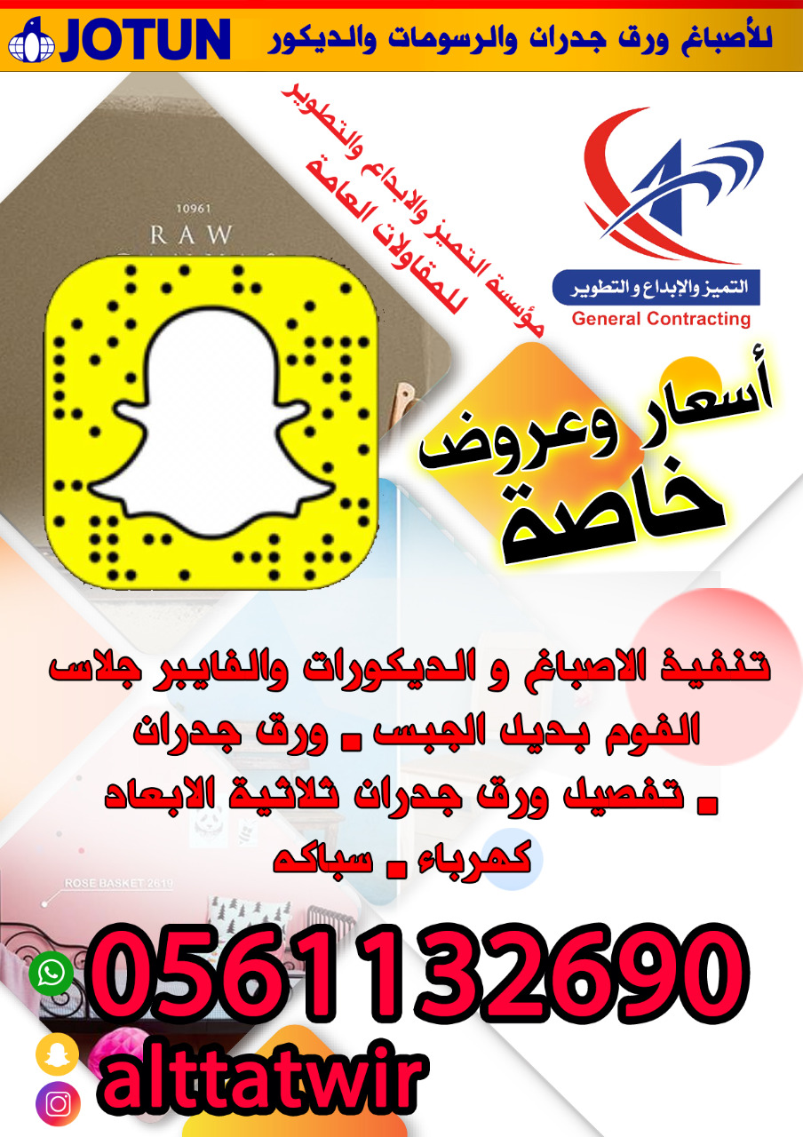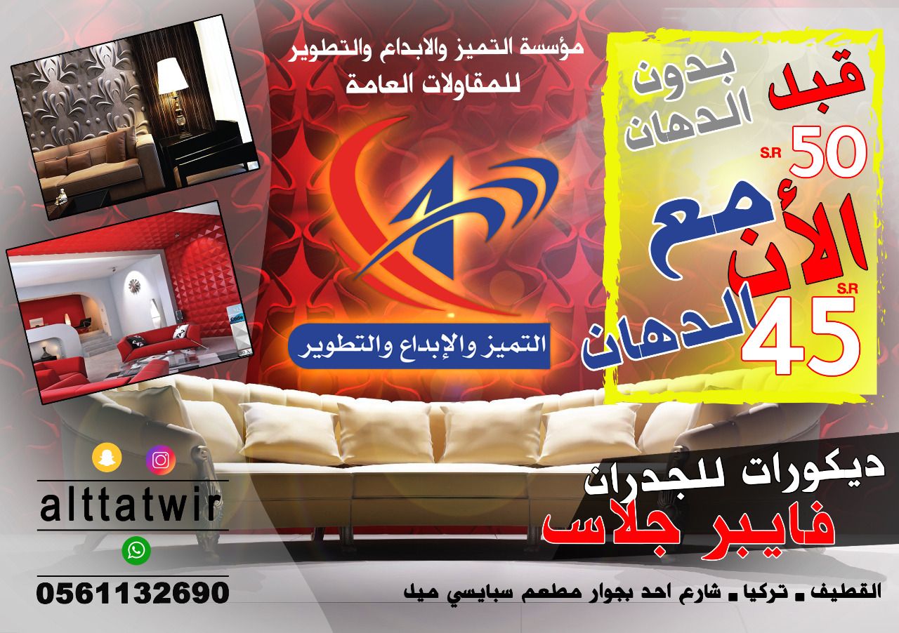 تعلن مؤسسة التميز والإبداع والتطوير لتنفيذ الأصباغ - والديكورات - بديل الخام - بديل الجبس الفوم - تفصيل ورق جدران ثلاثية الابعاد - وورق الجدران - والفايبر جلاس‏ هذا العروض الفتره محدودة
